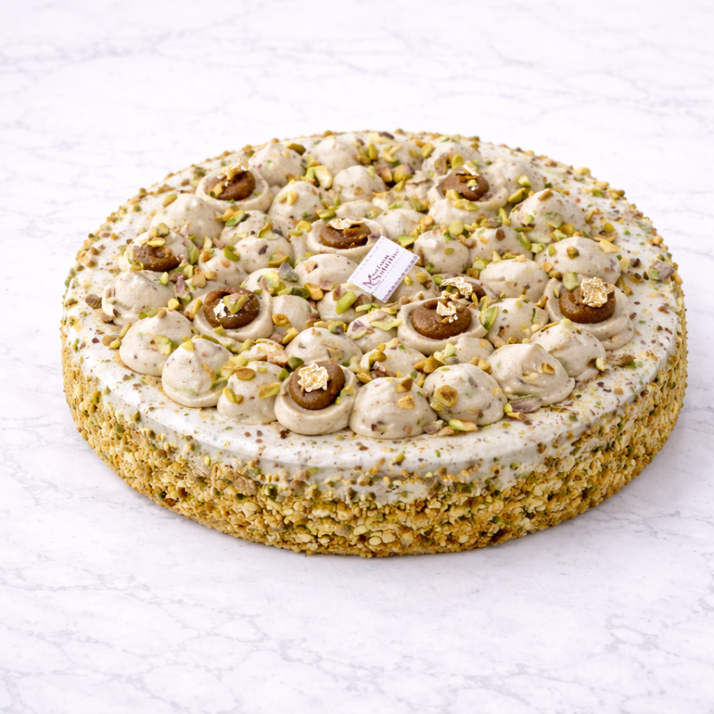 Meringue aux éclats de Pistache, crème onctueuse parfumée à la pistache, praliné pistache maison.